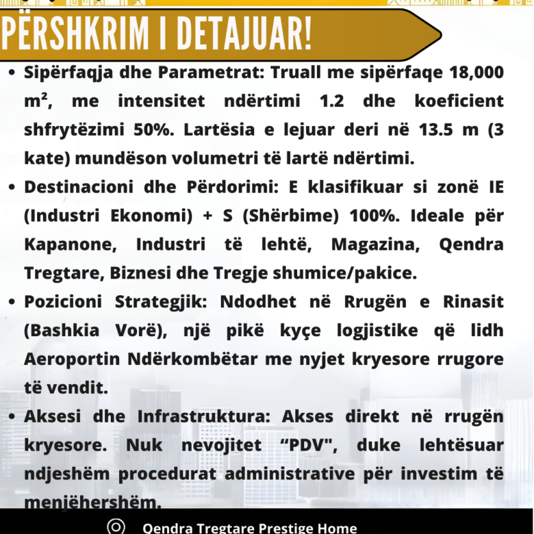 Kjo pronë përfaqëson një mundësi ekskluzive për zhvillimin e një njësie industriale ose shërbimi në një nga akset më strategjike që lidh Aeroportin Ndërkombëtar “Nënë Tereza” me autostradën. Me parametra ndërtimi dhe destinacion të qartë ekonomik, parcela është e gatshme për investim të menjëhershëm.