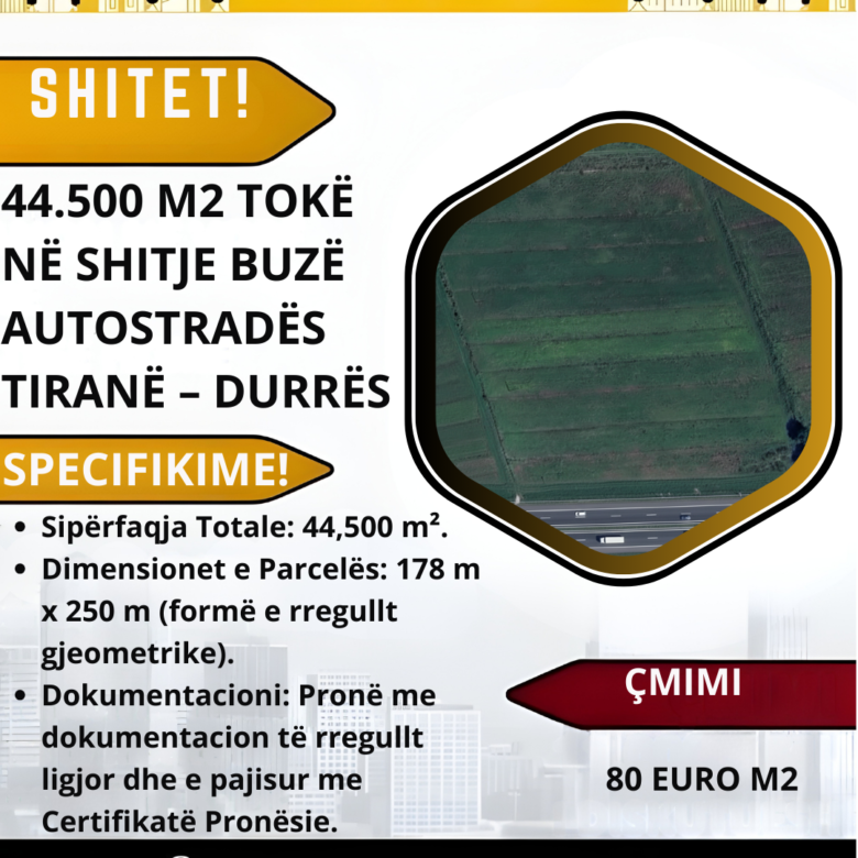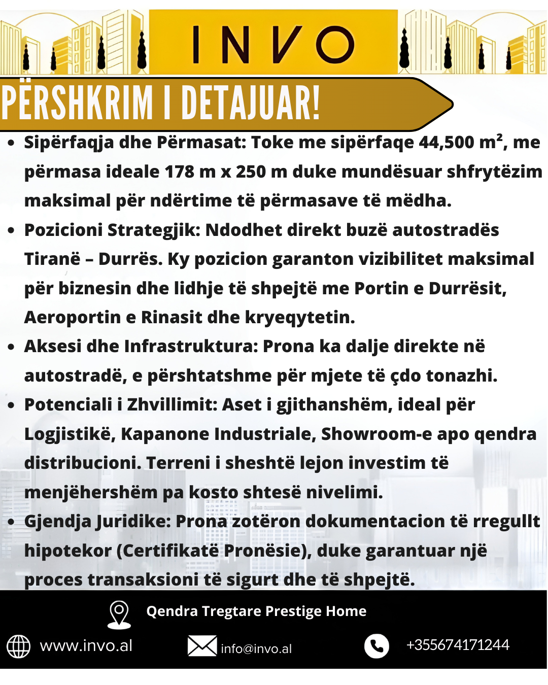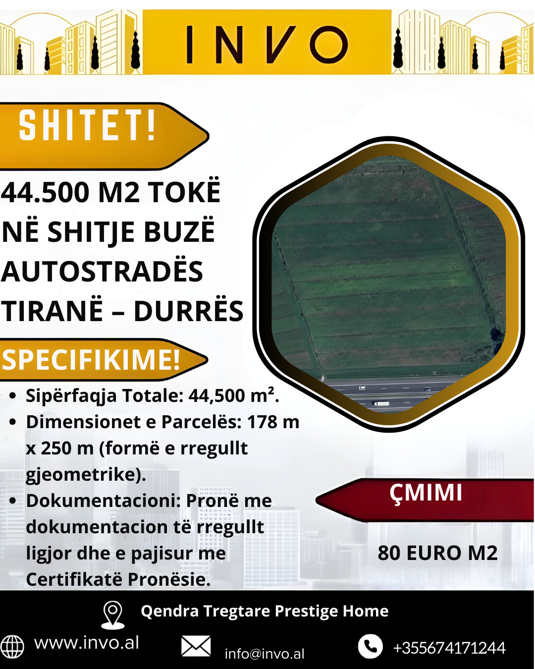 44.500 M2 Tokë buzë Autostradës Tiranë – Durrës