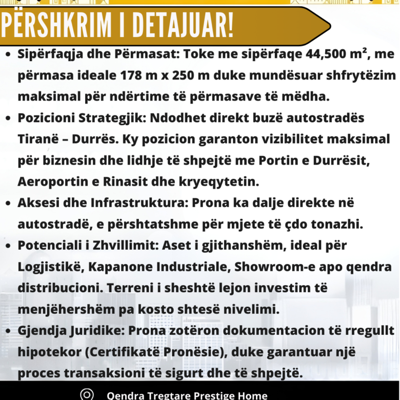 - Pozicioni: Direkt buzë autostradës Tiranë – Durrës.