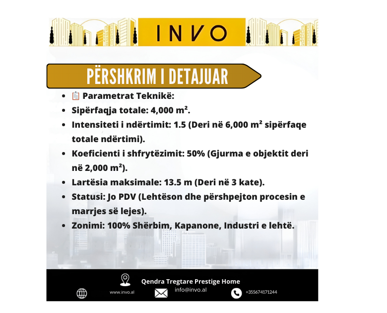 - Intensiteti i ndërtimit: 1.5 (Lejon deri në 6,000 m² sipërfaqe totale ndërtimi).