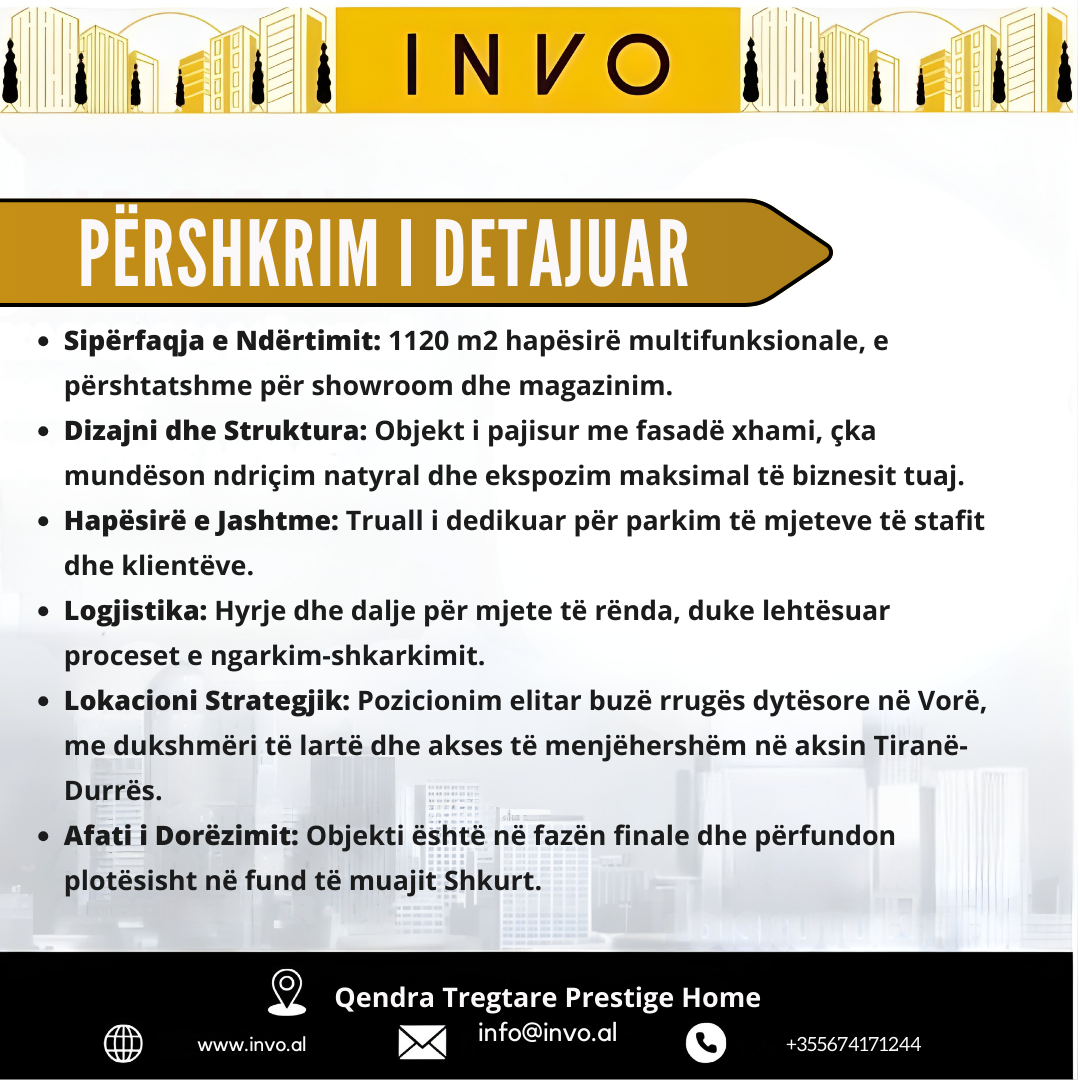 Një mundësi unike për biznesin tuaj në aksin më të rëndësishëm industrial Tiranë-Durrës! Ky objekt modern, që përfundon në fund të muajit Shkurt, kombinon në mënyrë perfekte imazhin e një Showroom-i me fasadë xhami dhe funksionalitetin e një kapanoni industrial.
